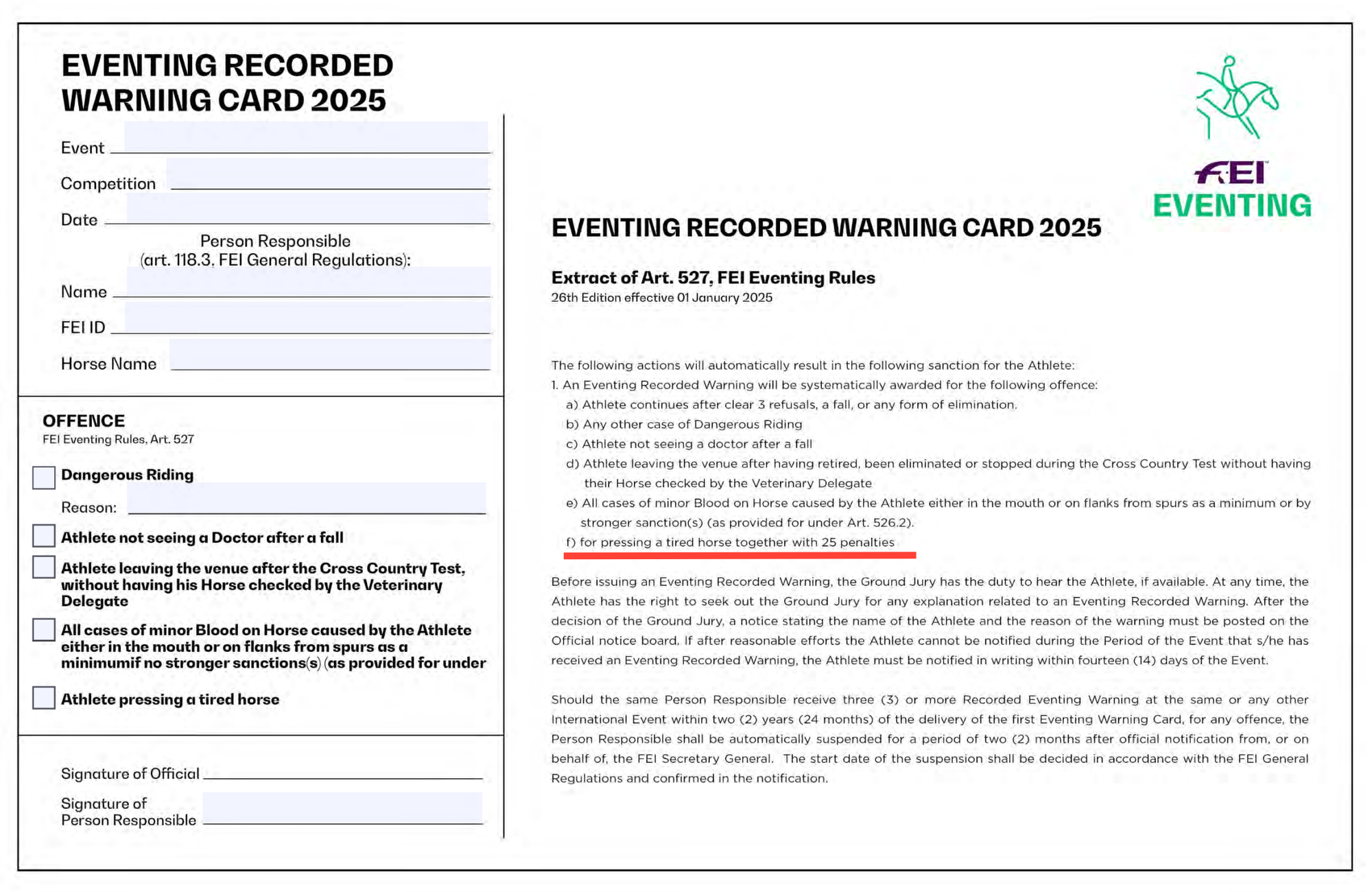 - Riders who press on with tired horses could face automatic penalties. [Thought that was already regulated in the warning cards, but then again, rules are not always followed now, are they... šš»]