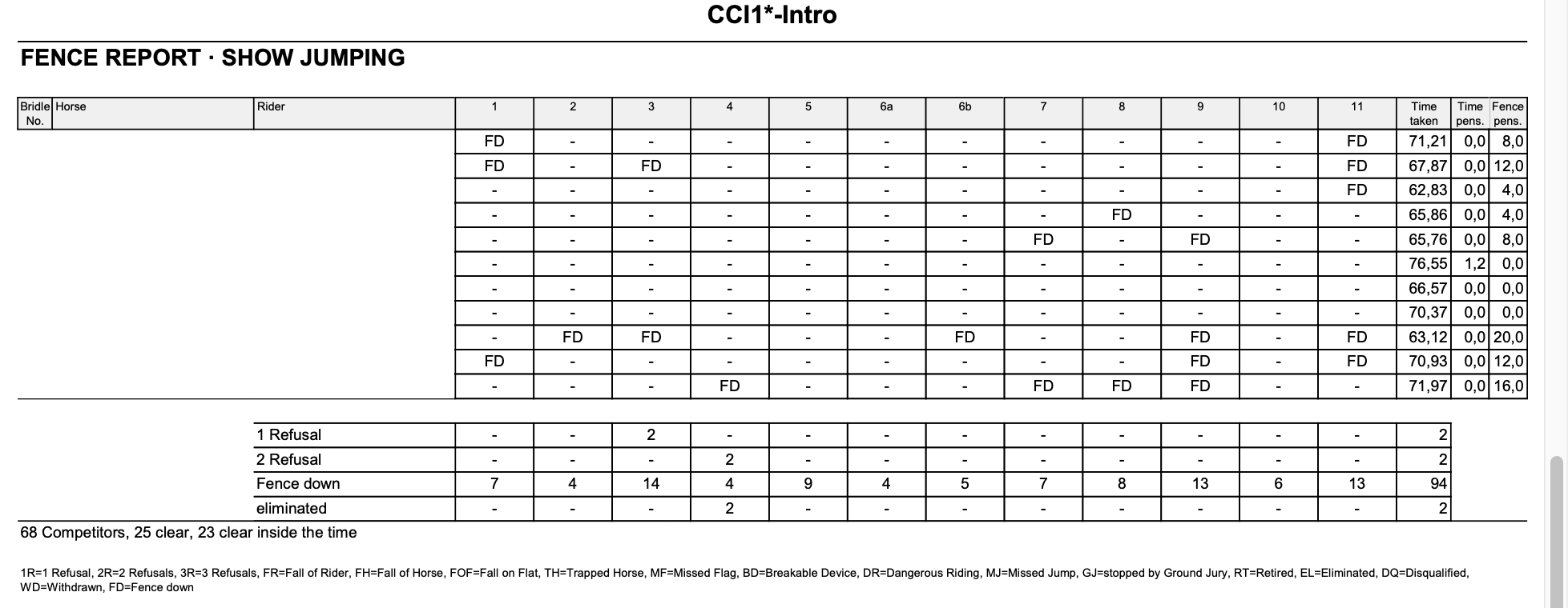 The fence report speaks for itself. So does the final page of the individual result in the class. Here there are two combinations scoring below 55% in dressage, TWO!