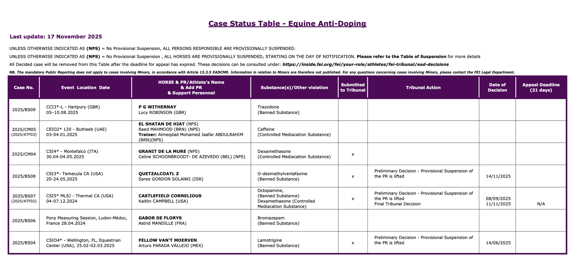 The newest case surfaced only recently. During the August 2025 Hartpury event, P. G. Withernay, ridden by Lucy Robinson, reportedly returned a positive test for trazodone.